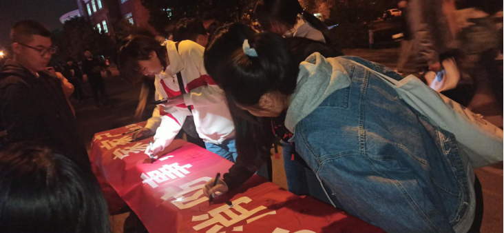 宣传活动一开始来来往往的同学们便不断前来关注,消防意识十分高涨,在学生会和团总支成员的讲解和介绍中同学们纷纷在宣传条幅上签上自己姓名以表示对消防公益活动的支持和重视。