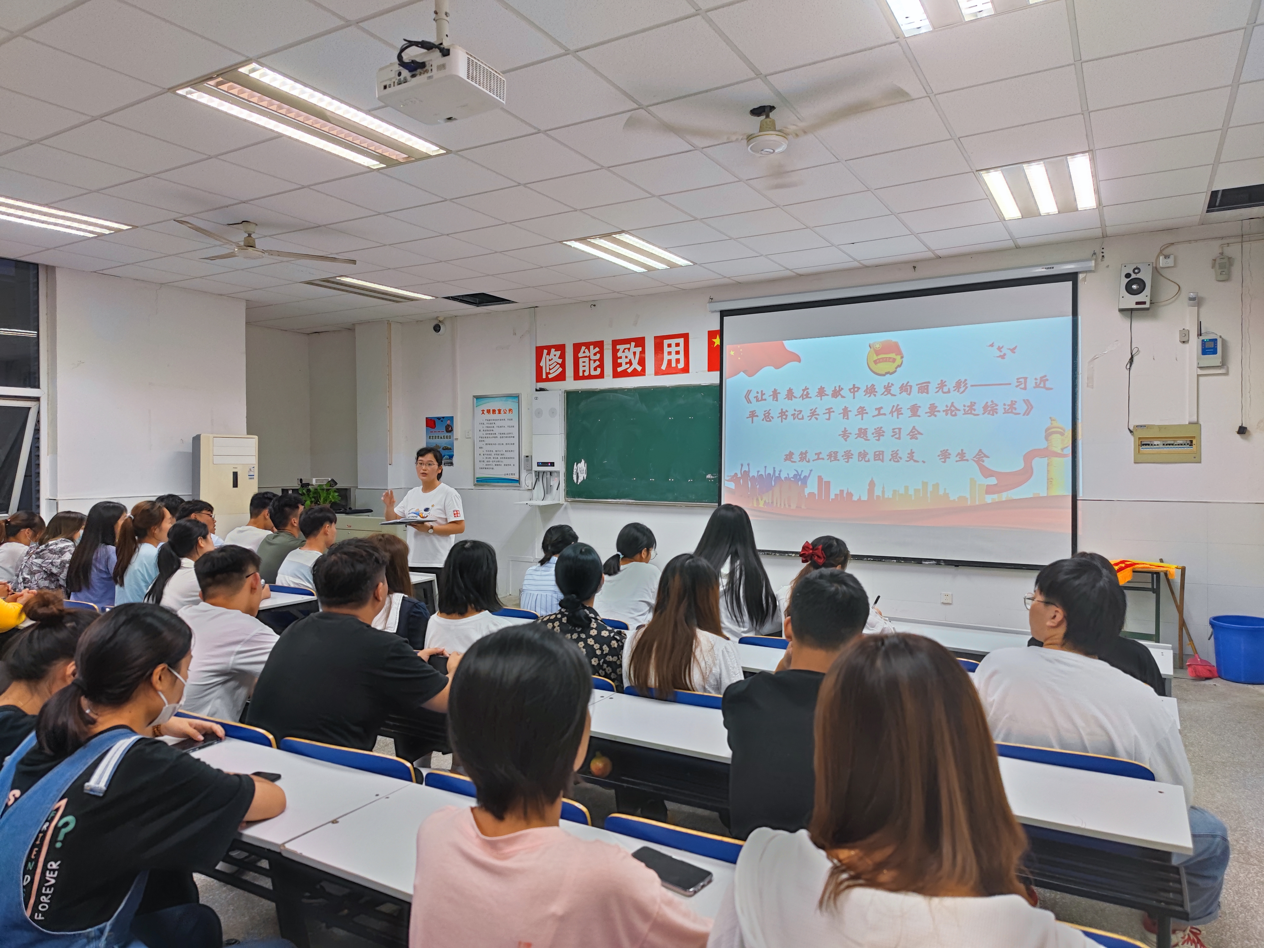 在党史学习教育的重要时刻,五四青年节当天,人民日报刊发了《让青春在奉献中焕发绚丽光彩--习近平总书记关于青年工作重要论述综述》理论文章,此文一经刊发,即在建工青年中引发热议。9月7日,建筑工程学院团总支、学生会组织学生干部及学生代表召开专题学习会,再次深入学习“习近平总书记关于青年工作重要论述综述”。学习会由学院团总支书记谭康慧主持。