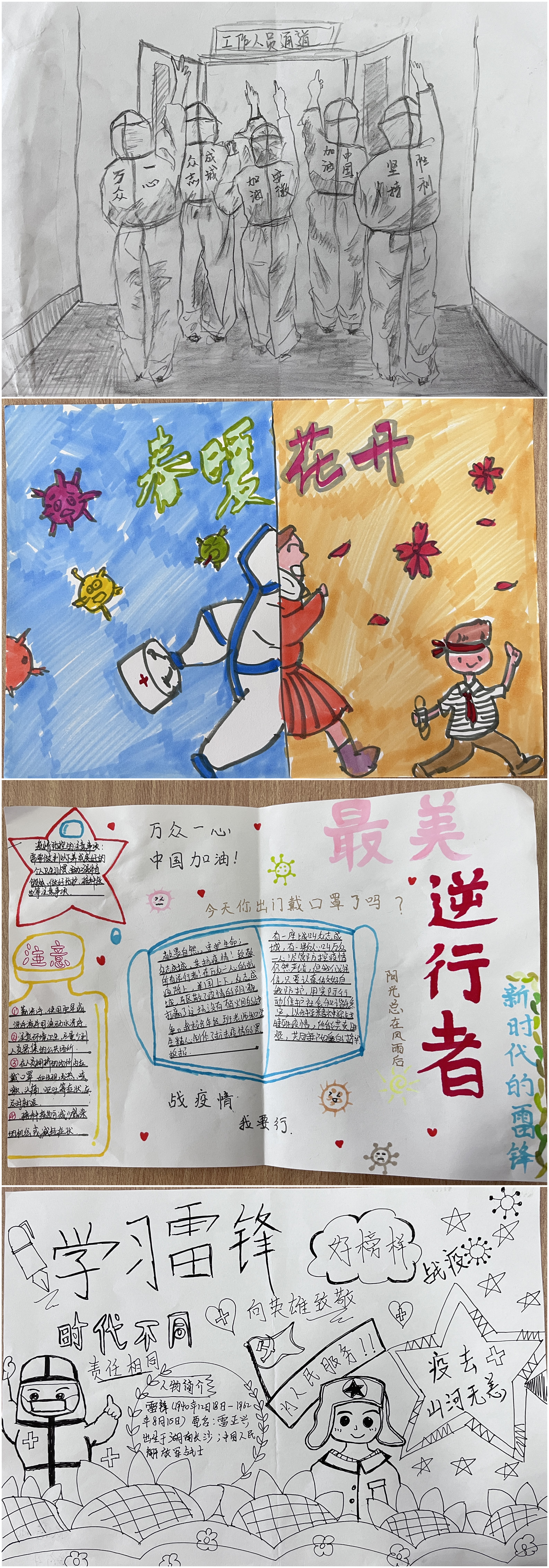 活动发出,全院学生都踊跃参与。以此次活动为契机,向一线抗击疫情的工作者们致敬,用画笔定格感动,以书画传承雷锋精神,传达万众一心的强大正能量。在学生们的巧妙构思下,每一幅画都格外的独特。