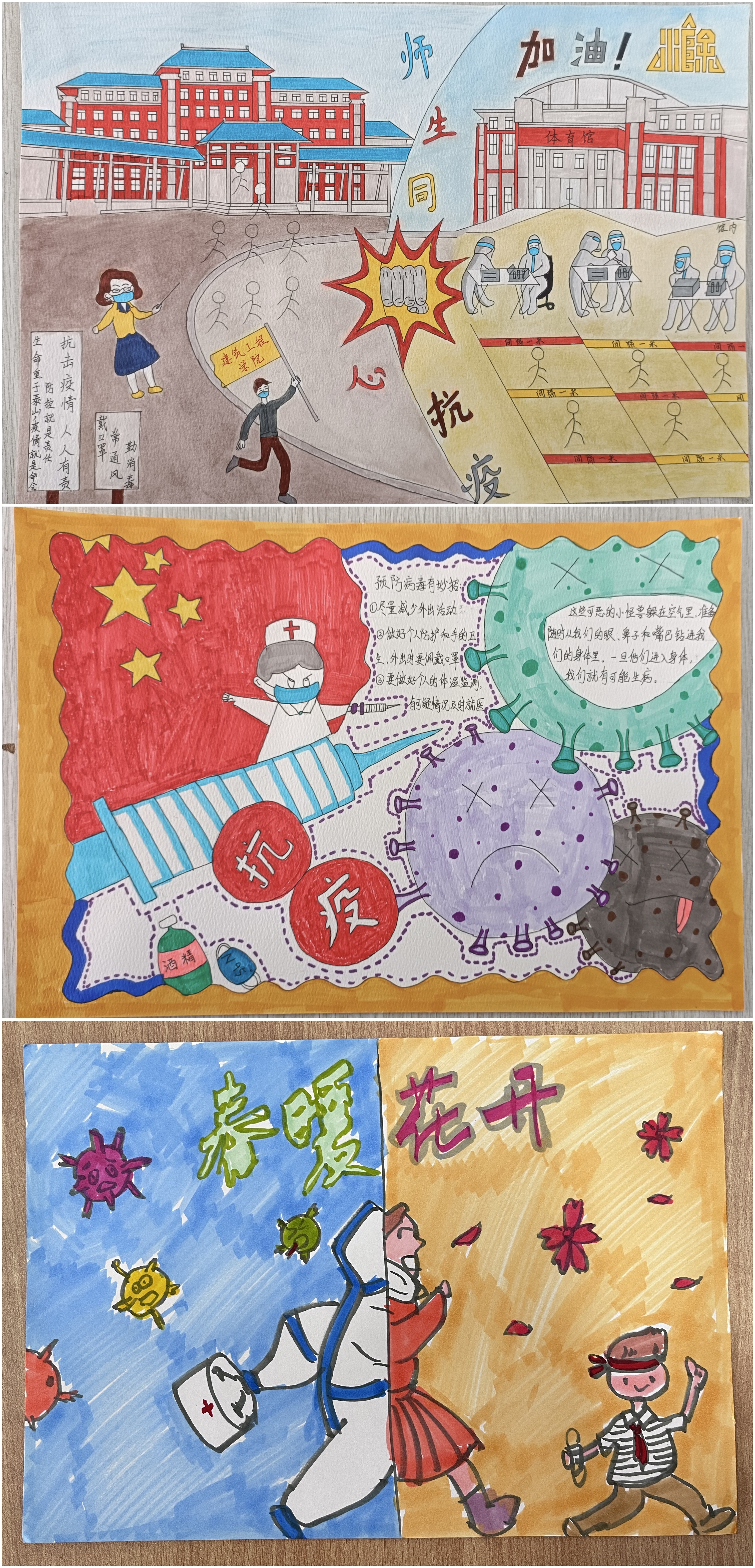 绘画者默默的将自己的所见所闻、所思所想化作创作的热情,化为无声的关切,将抗击疫情的感人场面、动容之情、难忘时光以作品的形式鲜活生动地展示给大家,描绘了同学们正确的生活方式以及自觉防护的积极态度,期望用有温度、有力量的手绘作品鼓舞斗志、共克时艰,凝聚抗疫力量,传递战疫必胜的信念和决心,在疫情防控工作中贡献一份艺术力量。