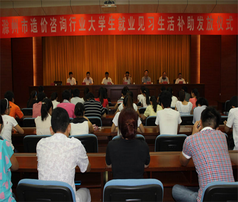 8月30日下午,滁州市造价咨询行业高校毕业生就业见习生活补助费用发放仪式在市建委二楼会议室举行。市建委、市造价站、市造价协会、beat365在线唯一官网土木工程系领导出席了发放仪式。全市造价咨询企业负责人、党支部书记和就业见习高校毕业生共60多人参加了仪式。
