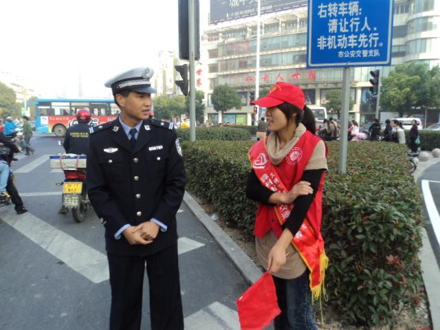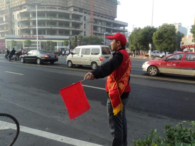 10月17日上午7时,土木系的青年志愿者服务队已经早早来到了滁州市高杆灯路,协助交警部门加强道路交通管理,劝阻非机动车、行人交通违法行为,倡导文明交通,加强交通安全宣传。