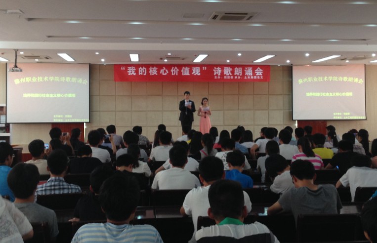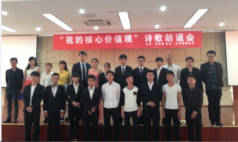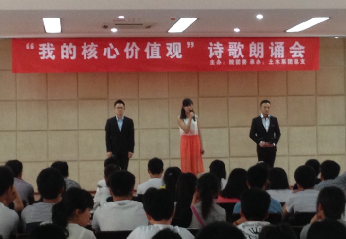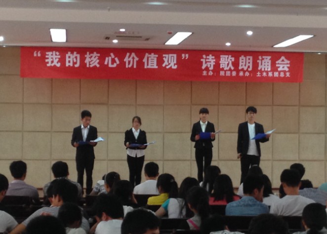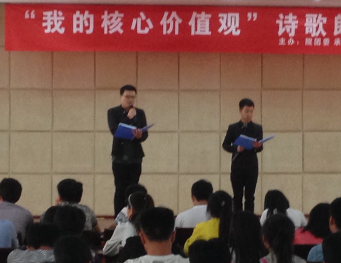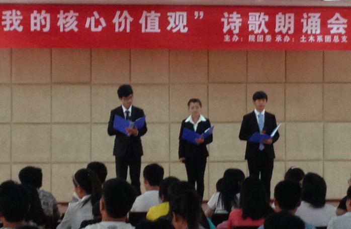 5月23日中午,由院团委主办,土木系团总支承办的“我的核心价值观”诗歌朗诵会在学院综合楼五楼报告厅举行,来自8个系部的同学朗诵了10余首歌颂社会主义核心价值观的历代名家名作,200余名同学在现场观看了表演。