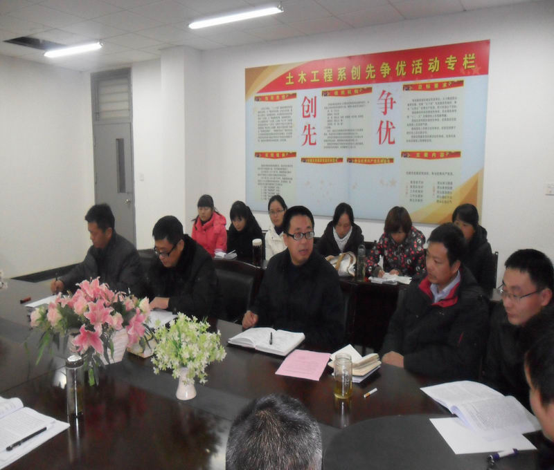 20111212日下午四时,土木系召开教学工作座谈会,出席本次会议的有院长助理刘宏、学生处处长李平权、系主任朱永祥、系书记刘文元、各教研室主任以及骨干教师。首先朱主任代表全系教职员工欢迎院领导来土木系指导教学工作,然后对土木系十年来教学工作进行了总结,并与在座教师讨论了江院长在院教学工作大会上的报告。