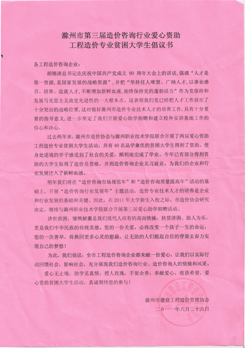 8月26日,滁州市造价咨询行业发出爱心资助我院土木系工程造价专业贫困大学生倡议书。自2009年以来,滁州市造价协会连续两年资助我院土木系工程造价专业贫困大学生,共有40多名品学兼优的贫困学生得到了资助。今年,协会将继续资助我院土木系造价专业学生,我院对他们的爱心义举表示衷心地感谢!