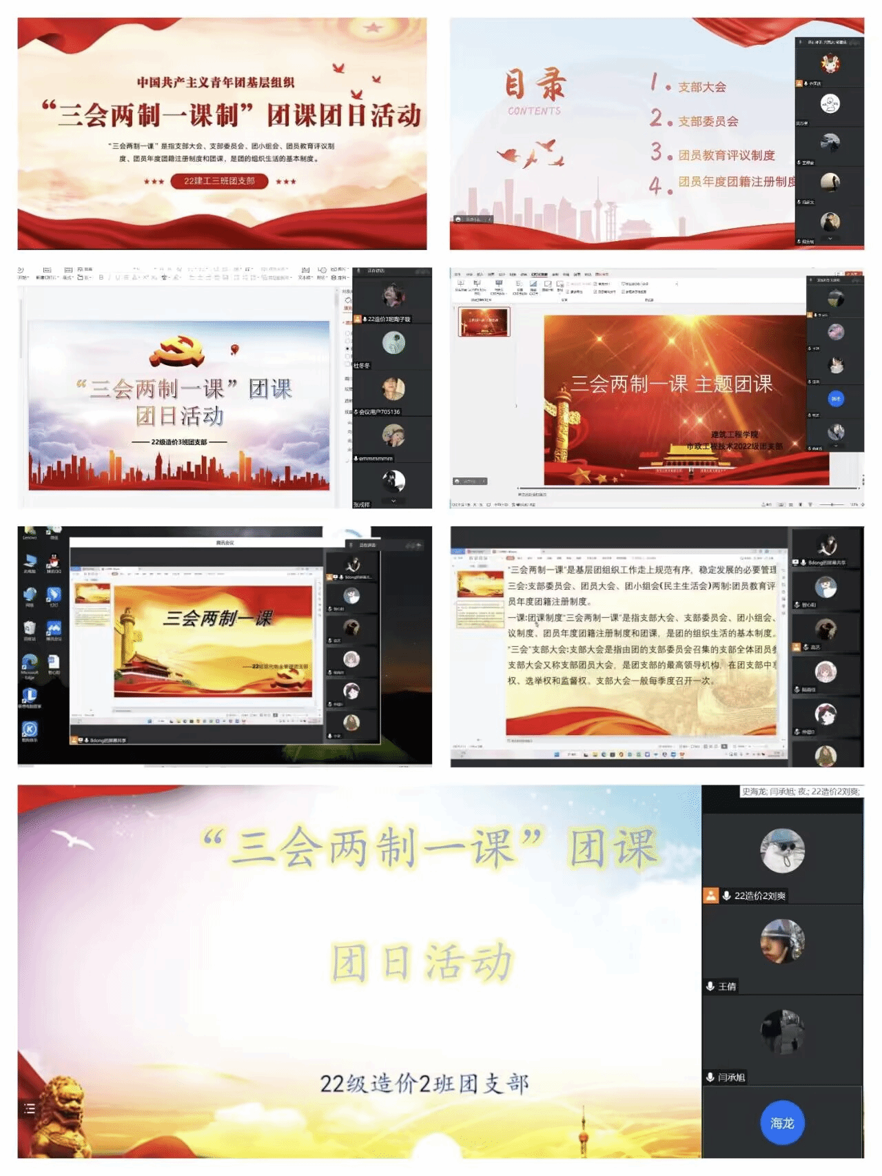 为健全共青团的组织生活,加强团支部管理,保持和增强团干部的政治性、先进性、群众性,加强团员思想政治教育和自我教育。建筑工程学院于12月2日在各班级开展“三会两制一课”主题活动。