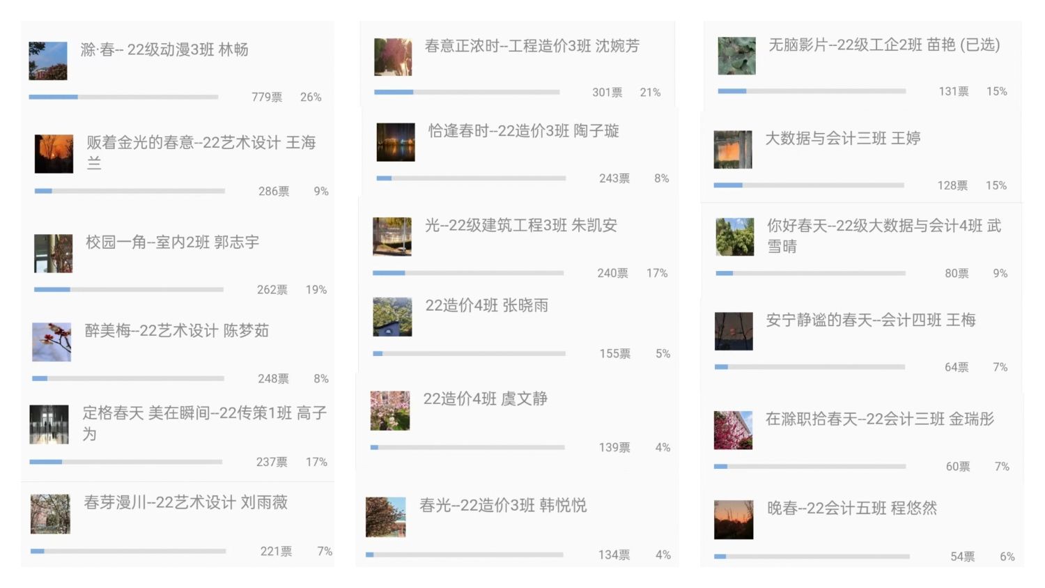 此次活动采取线上征集的方式,大家积极踊跃的将自己喜爱的照片上交。经过初步筛选,共18张摄影作品入围大众海选比赛。这些作品从不同方面集中反映了beat365的校园风景、生活;作品内容丰富,有唯美灿烂的校园美景,有个性分明的滁职建筑,有轻松愉悦的日常生活,在公众号上,同学们都被一幅幅唯美的照片内容所吸引,并踊跃地为自己喜欢的摄影作品投出宝贵的一票,活动进行的十分精彩。经过一周的投票,各个学院分别比出一等奖一名,二等奖两名,三等奖三名。其中传媒与设计学院林畅、管理学院苗艳、建筑工程学院沈婉芳荣获一等奖,校园中缺少的是发现美的眼睛,希望大家积极探索发现。