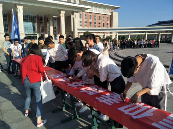 随着激昂的国歌唱响,国旗护卫队迈着庄严而整齐的步伐走到旗台下。 “ 升国旗, 奏国歌 ” ,全体同学庄重地注目着冉冉升起的国旗,表达着无限的敬意。嘹亮的国歌声回响在耳畔,五星红旗迎风飘扬。仪式接近尾声,同学们陆续在横幅上签名。