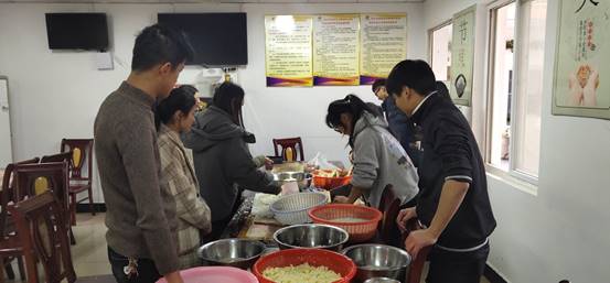 大家带着礼品到达敬老院,院长热情的接待了同学们。大家分工合作,配合默契,有的负责切白菜、调饺子馅,有的负责包饺子,有的同学自觉拿起了扫把和抹布主动帮老人打扫房间,擦洗玻璃和家具。寒流挡不住志愿者的热情,敬老院里流淌的是融融的暖意。