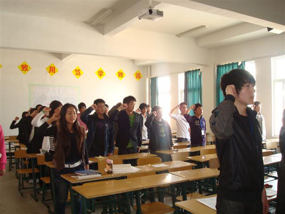大会在嘹亮的团歌声中拉开帷幕,程书记也同全体团干们一起在鲜红的团旗下举起右拳重温入团誓词。