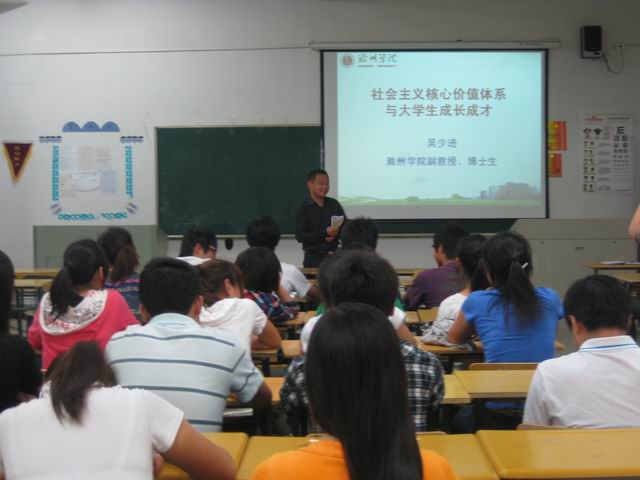 2011年6月15日下午 信息系学生会组织40余名同学聆听学生处组织的名家讲坛。安徽省哲学学会理事、滁州学院副教授吴少进博士为同学们做了一场主题为《社会主义核心价值体系与大学生成长成才》的精彩讲座。同学们在吴博士的带领下遨游了人生理想信念与价值诉求的海洋,受益匪浅。