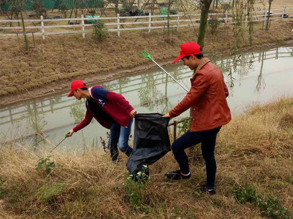 到达目的地金鹏生态园,同学们拿着垃圾夹子和垃圾袋对园区进行了一次地毯式的清理。班长高中昭以身作则,清理河道里的垃圾。同学们也自发的捡白色垃圾、烟头、纸屑、清扫卫生等。
