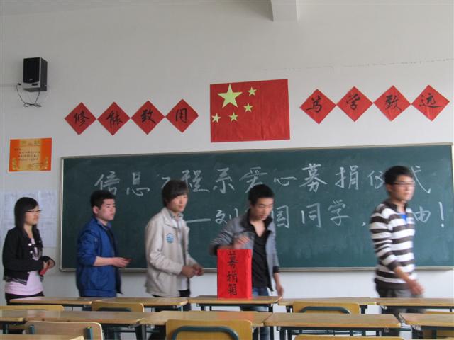 一方有难,八方支援,信息系各团支部得知我院艺术系刘宏国同学家庭的遭遇后,立刻行动起来组织爱心募捐。2011年4月14日下午,我系团总支专门组织了“爱在这里传递”的捐款仪式,各支部书记将从班级里汇集来的拳拳爱心郑重地投入了捐款箱,并在黑板上写下:“刘宏国,加油!”的字样,希望能够为帮助刘宏国同学家人早日战胜困难尽到自己绵薄之力。