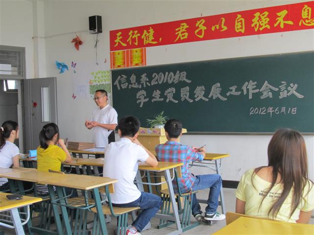 根据学院发展学生党员的方针政策和组织程序,信息工程系2010级22名入党积极分子考察期已满,经系团总支推荐,辅导员、班主任点评、学生座谈会、院组织人事处预审通过,2012年6月1日中午,信息工程系学生党支部在2505教室召开2010级学生党员发展工作会议,会议由学生党支部书记周忠祥主持。