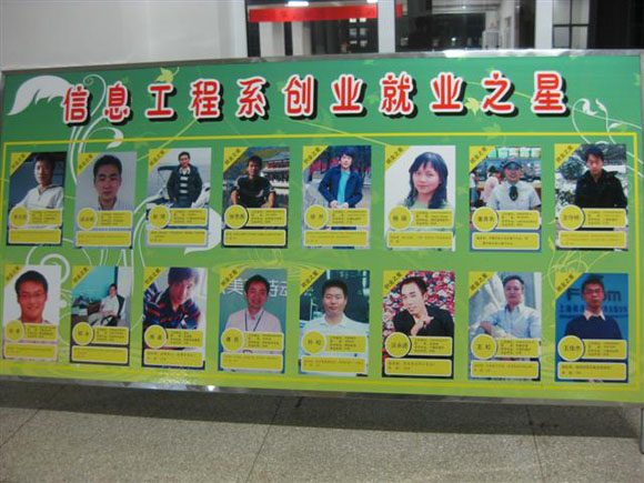 为能展现我系学生风采,用切实可行的就业、创业经验为即将毕业的学弟学妹们打开出路,在我系卜锡滨主任和程洪斌书记的部署下,我们积极联系往届毕业生,从中选拔出一批就业创业的优秀代表,并将他们的简要情况制成展板向新老生进行宣传,极大地鼓励了同学们就业创业的激情,许多同学前来咨询他们的成功经验,对未来充满了信心和期待。