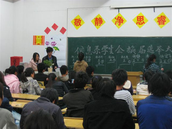 2010年11月17日下午5点,我系学生会在2514教室顺利举行换届选举大会。本次换届选举的职位是学生会主席,共有9名09级学干参加了竞选主席的演说。本次换届工作分几步进行,自愿报名 ,纪检部审核资格,然后干事投票作为群众基础票,占30%,部长投票占30%,主席团和老师投票占40%,最后再根据竞争上岗考核确定最终人选。据悉,学生会将在下周公布2010年新主席团成员。