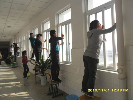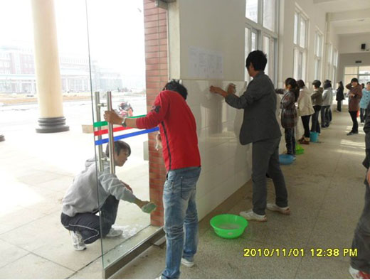 11月1日中午,艺术设计系60余名学生在学生会的带领下对本系艺术楼玻璃进行卫生清扫。
