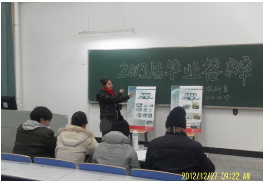 2012年12月27日,工业设计教研室在艺术楼102教室举行2013届工业设计、产品造型专业毕业答辩工作,王起老师主持。在答辩开始前,王起教师对答辩的过程进行认真细致的安排,明确任务要求。李雯雯、闫正洲、金希三名教师担任答辩评委工作
