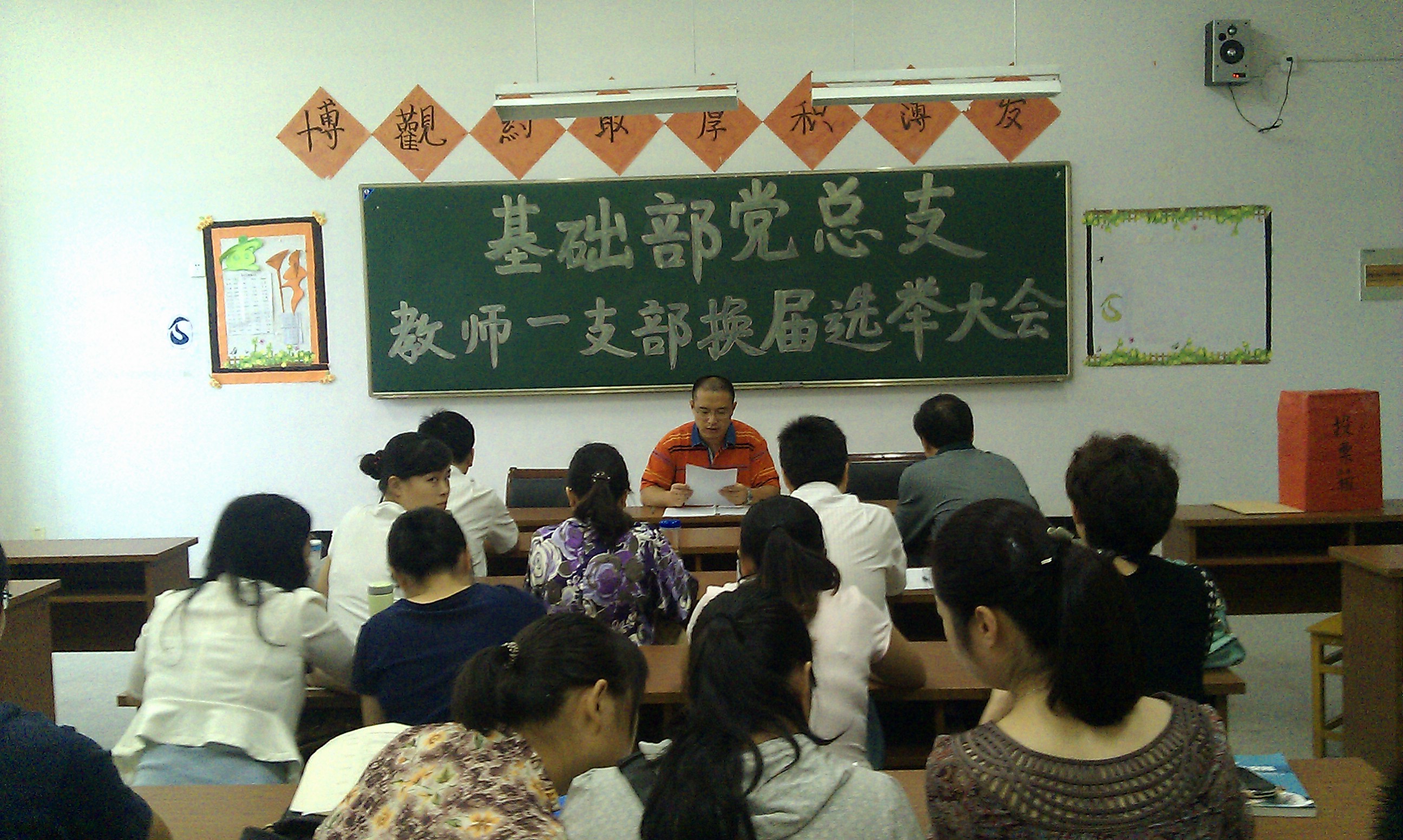 按照院党委会议决议精神,根据《中国共产党基层组织选举工作暂行条例》的有关规定,结合基础部党组织工作实际,按照党总支的具体部署,教工一、二支部换届选举大会在下午三时和四时分别召开。教工一支部书记张广龙同志因伤不能参会,会议由总支书记李超同志代为主持召开。二支部会议由陈兴友书记主持。