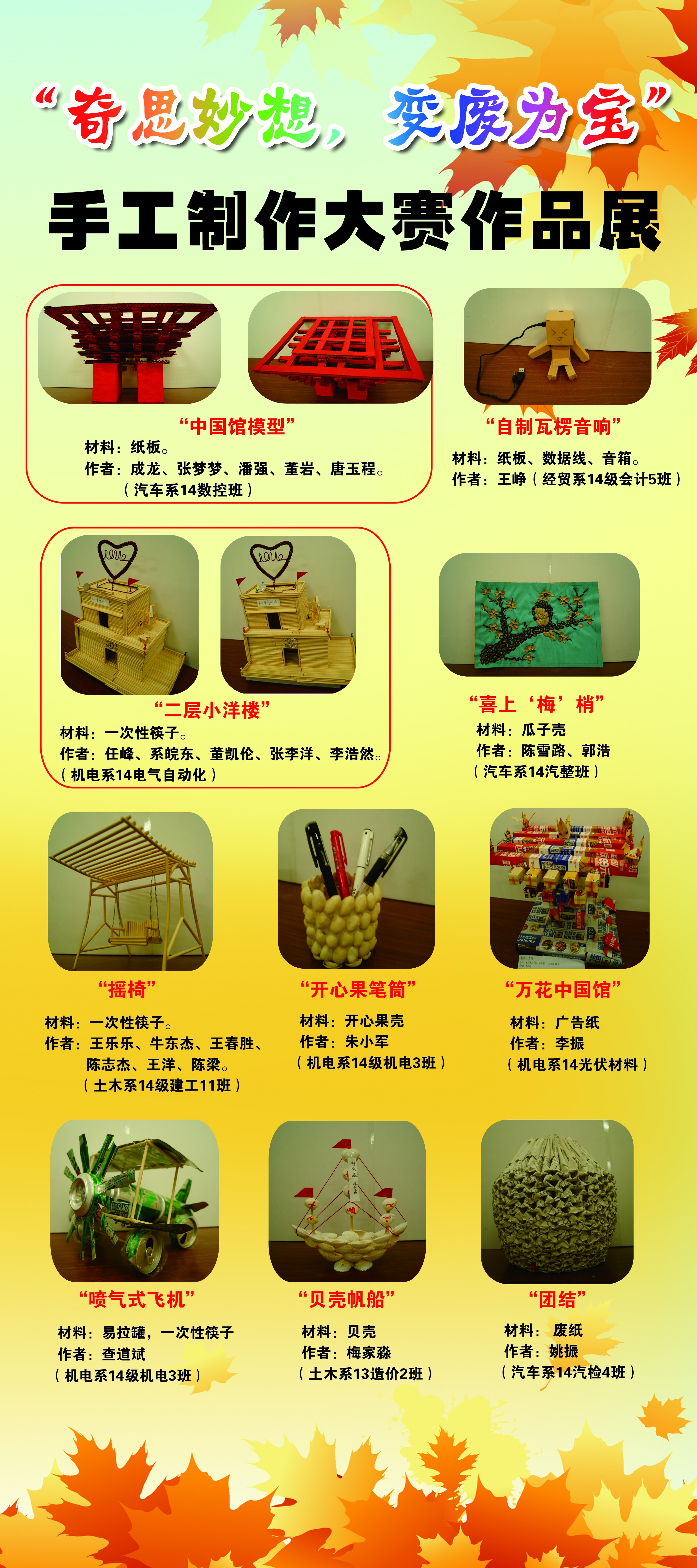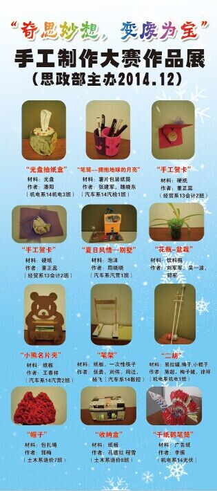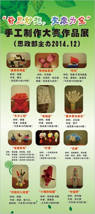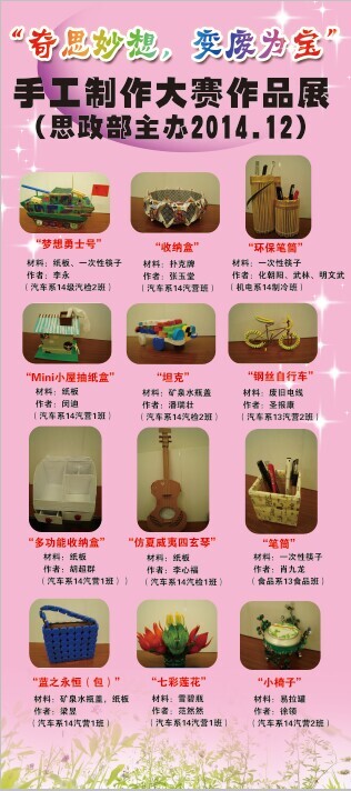 “奇思妙想,变废为宝”手工制作大赛已经全部结束,收到了很好的效果。感谢同学们的热情参与,请于本周内把参赛作品领回,不来认领的,视为自动放弃,将由思政部处理。领取地点一号楼(致真楼)217办公室,电话3854715,李老师13615504336,张老师13675506038。领取时间:本周9:00-18:00。