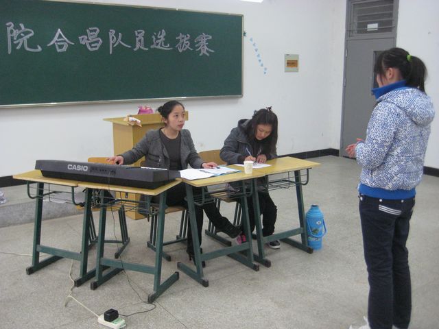 图:团委何文婧老师认真听选手唱歌