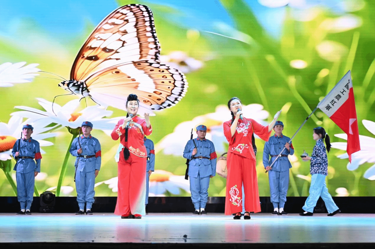 该节目以艺术与思政深度融合的形式,在beat365首次实现非遗传承人与高校师生同台演绎,打造了一场跨越时空的沉浸式教育课堂。作品巧妙融合民间音乐语汇与革命历史叙事,生动再现了抗日战争时期新四军将领罗炳辉率部驻扎滁州红山洼,与当地民众并肩抗日的峥嵘岁月。演出中,师生身着革命服饰,通过歌、舞、剧等多元艺术形式和质朴婉转的旋律传递红山儿女对革命先辈的深切缅怀。参演学生代表表示:“在创排过程中,我们既感受到南谯民歌的艺术魅力,更深刻领悟到传承非遗文化的时代责任。作为新时代青年,我们要让文化遗产在创新中焕发新光彩。”演出通过青春化诠释实现红色精神的代际传递,现场观众在革命场景的艺术再现中重温波澜壮阔的抗战岁月,气氛庄重而热烈。