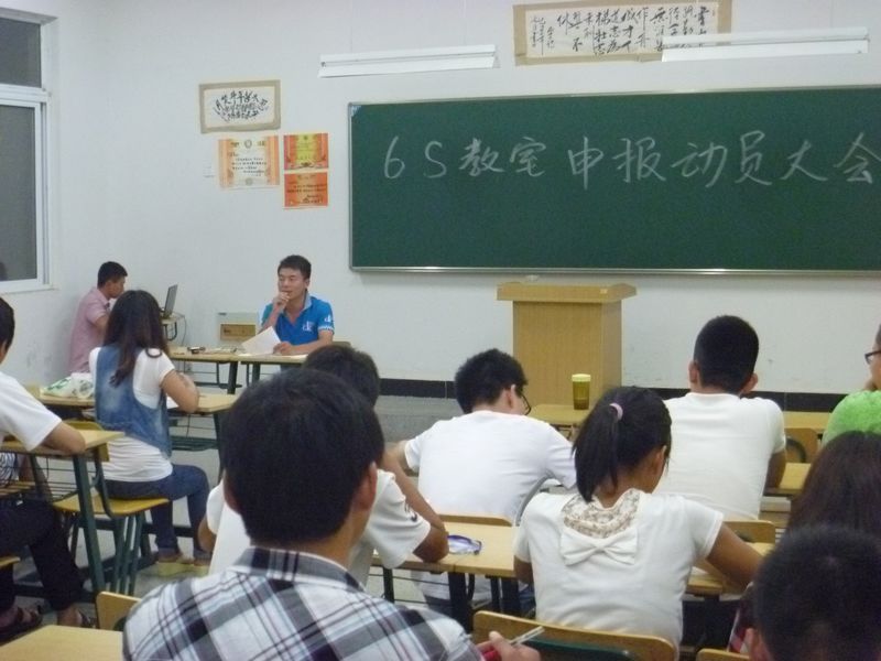 6月5日晚7点,生化系“6S教室”申报动员大会在团支书副书记的组织下召开,各班班长、团支书等学干参加了会议。副书记李现龙同学详细阐述了“6S教室”申报工作的积极意义;对各班级的6S申报工作提出了具体的要求,要求各班严格按照我系制定的评分细则打扫教室卫生、清除卫生死角;上课结束后各班以学干为核心组建卫生清扫小组,确保课后的教室保持干净、整洁的状态;对教室的布置与装饰做出较统一的规定,避免因过分装饰造成教室的杂乱与不庄重。