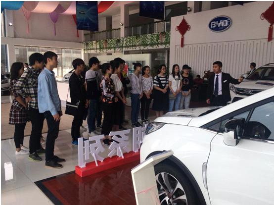 在比亚迪4s店,一位学长很热情的带领大家参观了比亚迪4s店的展厅、售后部门、维修车间;并向大家讲述了自己毕业到工作的经历,让大家认识到职场的残酷和珍惜时间的必要,学长的阅历对同学们走上社会有很大的借鉴作用。