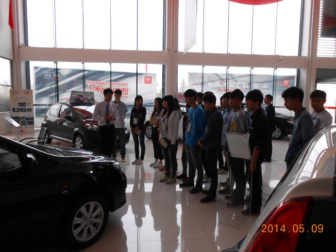 在比亚迪4S店。同学们学习了有关4S店的基本相关知识,详细阅读4S店的宣传杂志,仔细向专业人士询问学习,工作人员积极热情,耐心解答。同学们还亲自乘坐了不同品牌不同车型的汽车,实实在在的体会了其中的不同,对汽车的了解更真实准确。同学们了解了多种汽车的相关知识和目前汽车行业情况,对4S店的经营与运行也有了清楚的认识。