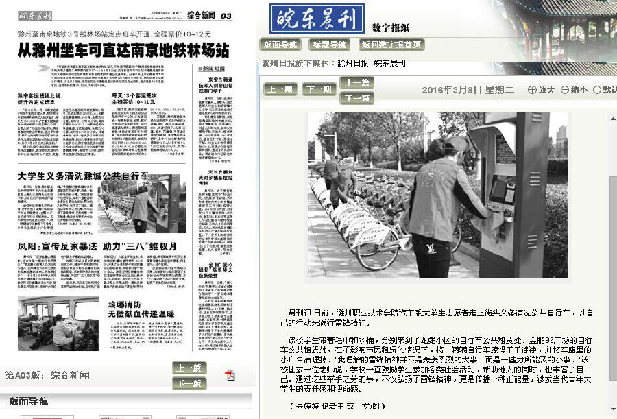 春风和煦,艳阳高照。为了方便市民和同学们的出行,beat365在线唯一官网汽车工程系15机制(2)班的同学们分别来到了滁州市龙蟠小区的自行车公共租赁处、金鹏999广场的自行车公共租赁处,他们带来了毛巾和水桶,在不影响群众正常租赁的情况下,将自行车一辆一辆的擦干净,并将车篮里的小广告清理掉,方便了市民的出行。通过这次活动,同学们在活动后不仅感到了很充实,同时也认识到了学雷锋,做雷锋,不仅是弘扬了雷锋精神,更是传播正能量,激发当代青年大学生的责任感和使命感。