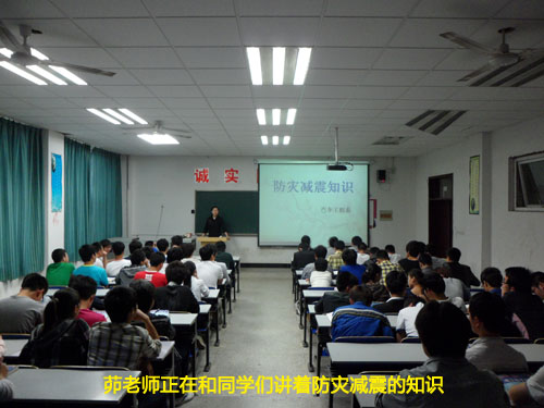 为了普及防灾减震知识,提高同学们关爱生命、防灾减震的意识,2013年5月27日下午16:30在5106教室由汽车系茆老师开展了防灾减震知识讲座。汽车系班级同学代表参加本次讲座。