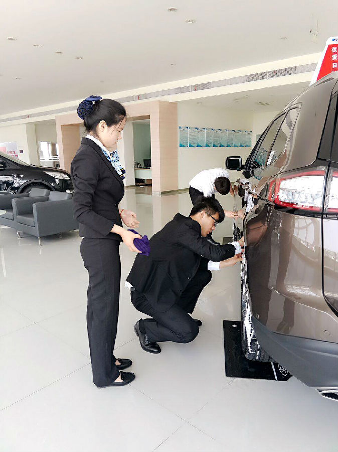 实习期间,同学们按照4S店的管理安排,每天早上8点准时报道,参加早会,主动积极的做“5S”清理工作,认真的擦洗每一辆车,然后认真的观看销售顾问对客户如何去介绍和推销车辆。在中午的休息时间也会积极主动的跟员工们交流,学习。下午,在售后修理区准备汽车“三件套”等汽车软装所需物品。在闲暇的时候研究各款汽车的相关资料。