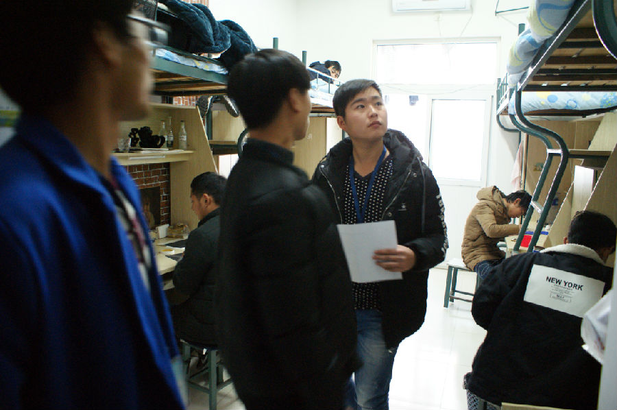 下午3点30分左右,宿舍卫生检查活动正式开始,本次检查内容比较全面,是否有违章电器,如热得快、电饭煲、不跳闸的热水壶、电烤炉等的使用情况;是否有宿舍电器线路,如插线板插孔、电线外皮是否损坏等;是否有违章用电情况检查,是否存在乱接电器的现象,人走电源是否关闭;有易燃易爆物品,烟草、利器等危险用品检查等。