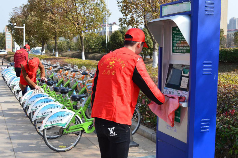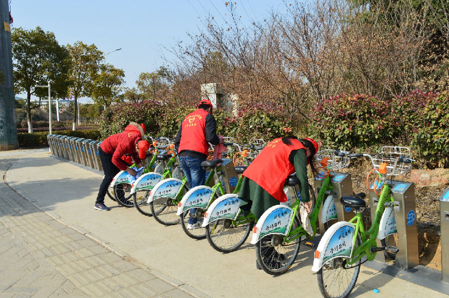 春风和煦,艳阳高照。为了方便市民和同学们的出行,机制2班的同学们分别来到了滁州市龙蟠小区的自行车公共租赁处、金鹏999广场的自行车公共租赁处,他们带来了毛巾和水桶,在不影响群众正常租赁的情况下,将自行车一辆一辆的擦干净,并将车篮里的小广告清理掉,方便了市民的出行。