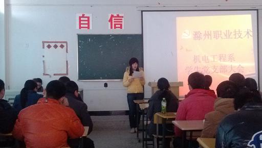 2013年1月5日下午,汽车工程系学生党支部大会于5410教室召开了关于接收闫其堪等55名同学为中共预备党员的支部大会。本次会议由吴佳佳老师主持,机电系学生党支部党员及拟发展的五十多名同学参加。