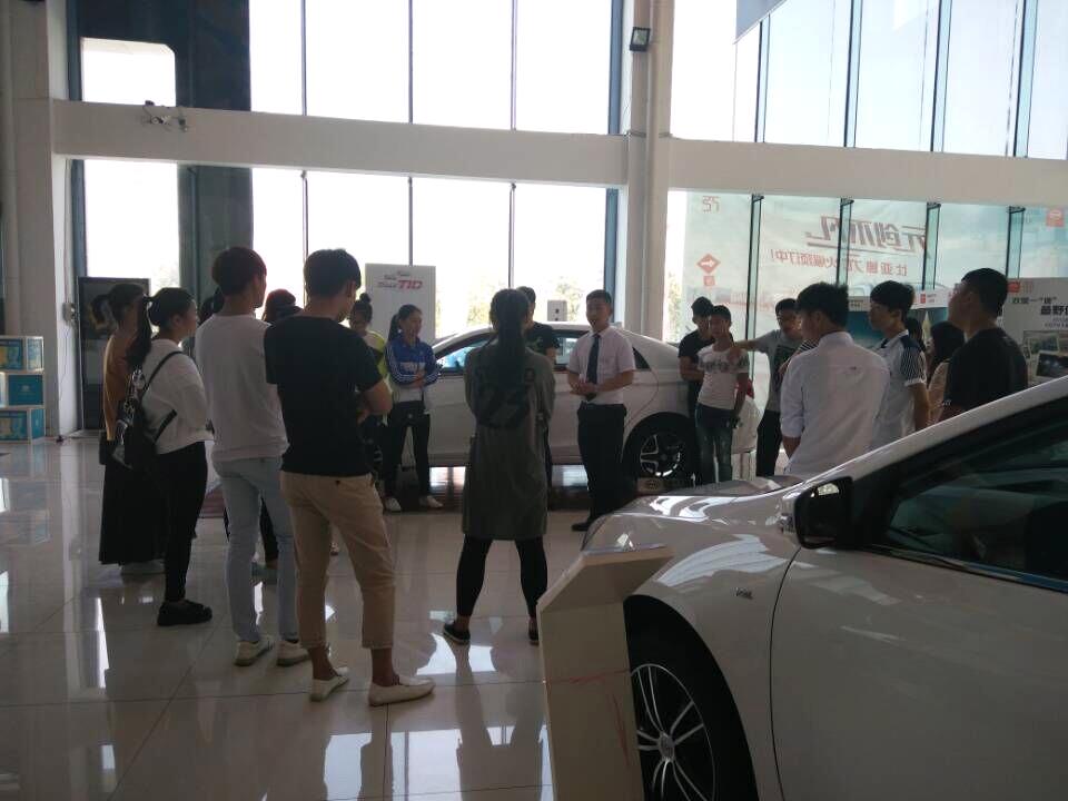 在这两家4S店,同学们参观了各个工作岗位,了解了4S店的工作流程。比亚迪4S店和福特4S 店分别代表了国产品牌企业和合资企业的管理模式。在比亚迪4S店,一名学长为同学们讲述了他从毕业到现在的工作经历和工作经验,让同学们感受到 职场的残酷,和走进社会的不易。也鼓励同学们从现在开始行动起来,为自己以后走进职场打下基础。