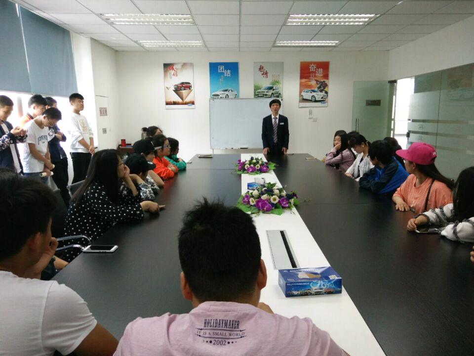 在福特4S店,培训经理徐老师为同学们讲述将来参加工作面试时应做好怎样的准备。最后送给同学们一句话“我们和别人吃的一样,住的一样,玩的一样,我们凭什么比别人成功”,他让同学们领悟这句话,让同学们受益匪浅。