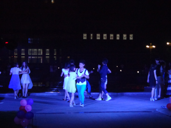 舞会开始前,同学们都怀着期待的心情,静候着开场。一曲美轮美奂的《惊鸿舞》拉开了此次舞会的序幕。随后,浪漫的华尔兹将舞会的浪漫氛围推向极致,在场的同学们在领舞者的带动下,也加入到舞蹈的阵营中,各自邀请舞伴,随着音乐翩翩起舞,机电系的陈琴老师也上台和舞伴跳了一段华尔兹,尽现优雅迷人的一面。随后汽车系的一段激情澎湃的舞蹈《千方百计》high翻全场。舞会的尾声同学们手拉着手奔向会场的喷泉中,快乐地舞蹈。在欢笑声中,舞会圆满落幕。