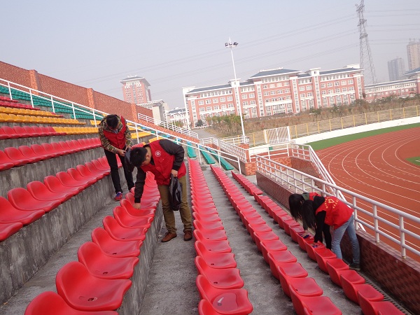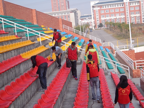 2014年11月12日中午,汽车系的青年志愿者们为第十一届运动会开幕式圆满召开清扫看台,给观众们提供一个良好的观看环境,他们带着清扫工具认真的打扫椅子上的污渍,清除看台上的垃圾,为操场留下一道漂亮的弧线。同时预祝汽车系的运动健儿们能够获得佳绩。
