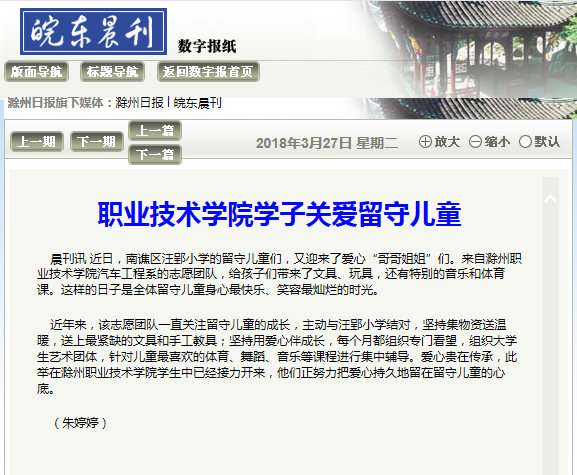 皖东晨刊报道汽车系开展关爱留守儿童志愿活动