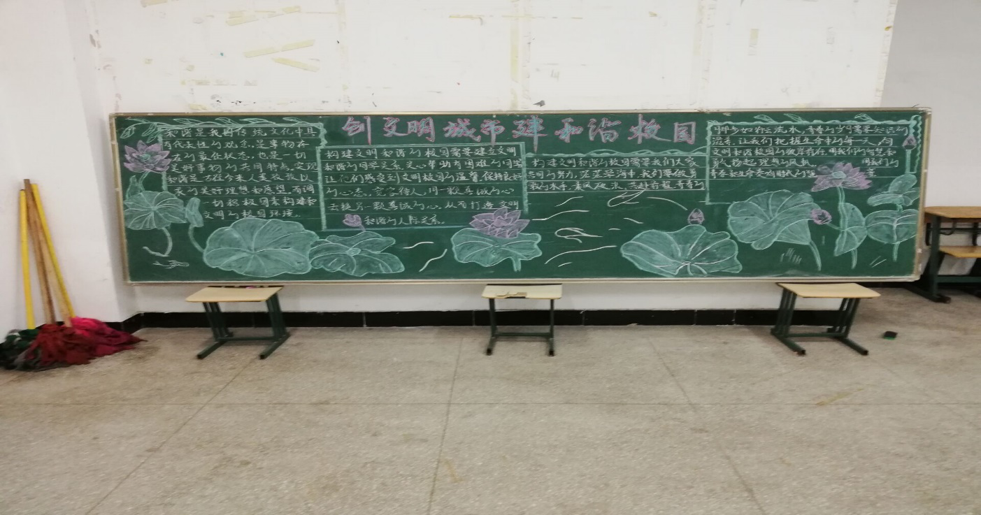 经过前期精心的准备、资料的收集,在各班同学们的共同努力下,都能按照要求认真的完成黑板报的制作。各班参评的黑板报内容充实,构思新颖,画面美观,书写规范,制作出的板报不仅美观大方、创意新颖,而且色彩协调、图文及装饰布局合理,主题非常鲜明,形成了一道亮丽的风景线。充分展现了学校师生积极向上的精神文明风貌,营造了浓郁的校园文化氛围。