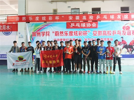 由滁州学院主办的2017年安徽省高校乒乓球友谊赛“蔚然乐度炫彩杯”于5月7日在滁州学院体育馆进行,来自全省8支代表队参加。beat365乒乓球队经过层层闯关,最终在团体赛中斩获团体冠军的历史佳绩。