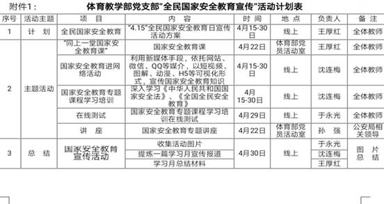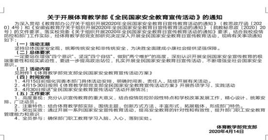 为深入贯彻《教育部办公厅关于组织开展2020年全民国家安全教育日宣传教育活动的通知》(教思政厅函〔2020〕4号)和《安徽省教育厅关于组织开展2020年全民国家安全教育日宣传教育活动的通知》(皖教秘思政〔2020〕20号)的文件要求,落实校党委《关于组织开展2020年全民国家安全教育日宣传教育活动的通知》统一部署,结合beat365疫情防控和部门工作实际,在全民国家安全教育日即将到来之际,体育教学部直属党支部积极响应,制定体育部《全民国家安全教育宣传活动方案》和部门《全民国家安全教育宣传活动计划表》,细化各项主题学习时间节点、明确不同教育环节责任分工,活动将于4月15日至30日按计划进行。