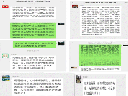 观看完《榜样5》,党支部通过微信群组织线上讨论,大家纷纷表示:作为一名体育工作者,要从榜样中汲取力量,不断坚定政治理想信仰,加强业务能力学习,以高度的责任感和使命感,切实履职尽责,让体育精神迸发更耀眼的光芒,为努力实现“十四五”期间学校体育工作再上新台阶贡献自己的全部力量。