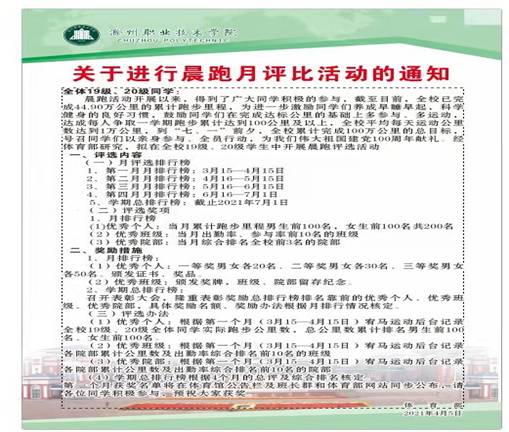 活动开展以来,得到了全体同学的积极参与,为表彰先进、树立榜样,激励同学们积极参与,体育部启动本学期晨跑月排行榜3月评选工作。评选3月15日-4月15日一个月以来综合排名表现优秀的晨跑先进个人、先进班级、先进学院,目前评选工作证稳步推进中。