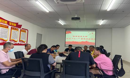 7月30日,体育部党支部在体育馆党员活动室组织召开理论学习研讨会,深入学习习近平总书记“七一”重要讲话精神,党支部书记王厚红主持学习交流会,体育部全体党员参加会议。