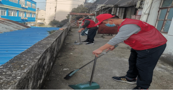 三位党员教师到社区了解社区工作情况,随后根据社区工作人员的指引安排,深入两栋老旧居民楼,打扫楼梯、走廊上的树叶和生活垃圾,清除卫生死角,整治人居环境,打扫后的居民楼有了明显改观。