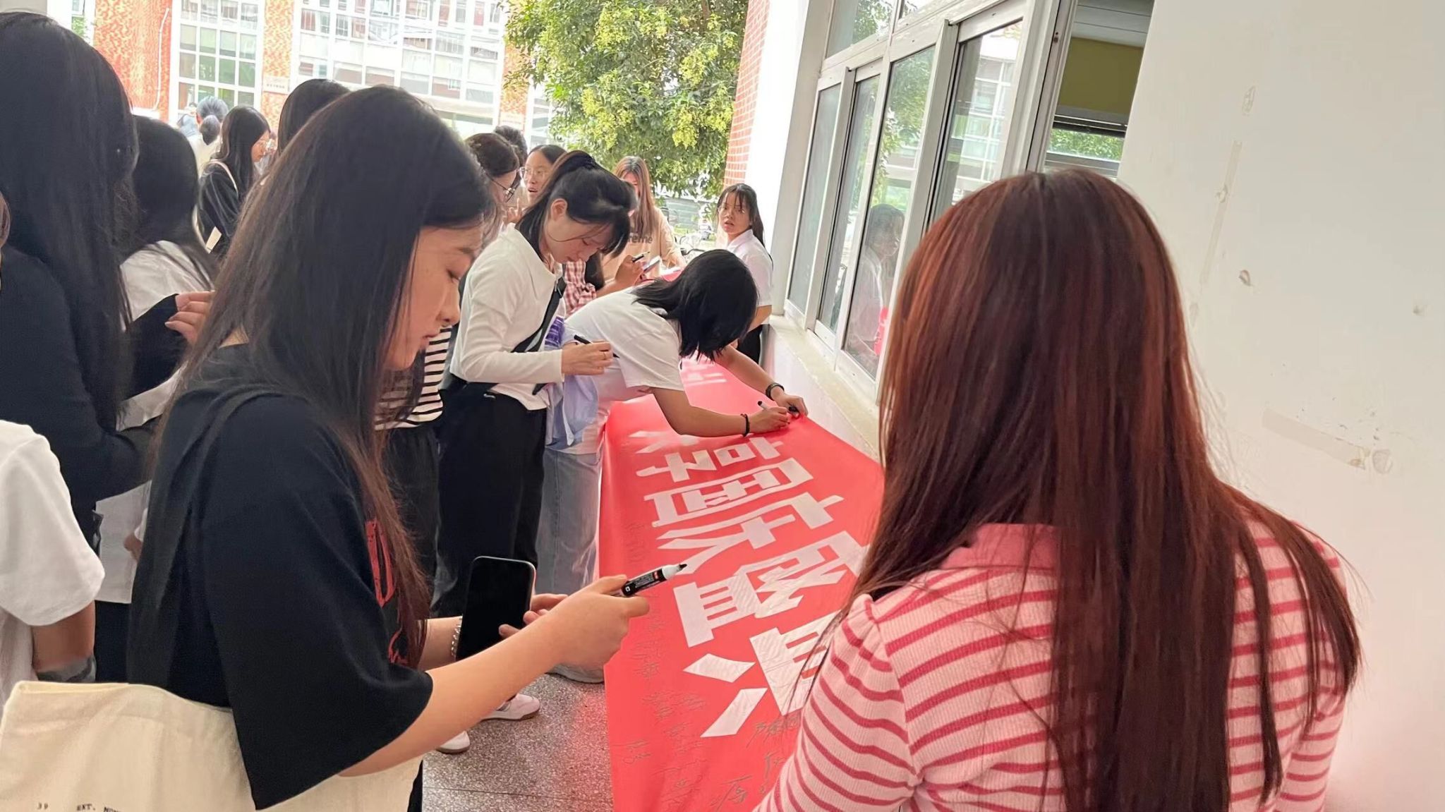 现场气氛十分热烈,同学们纷纷在横幅上写下对祖国的祝福,“祝祖国越来越繁荣昌盛”“祝愿祖国明天更美好”,简单质朴的话语,让活动的氛围达到高潮,表达对祖国的热爱之情。满载着同学们对祖国祝福的横幅成为校园内一道亮丽的风景线。
