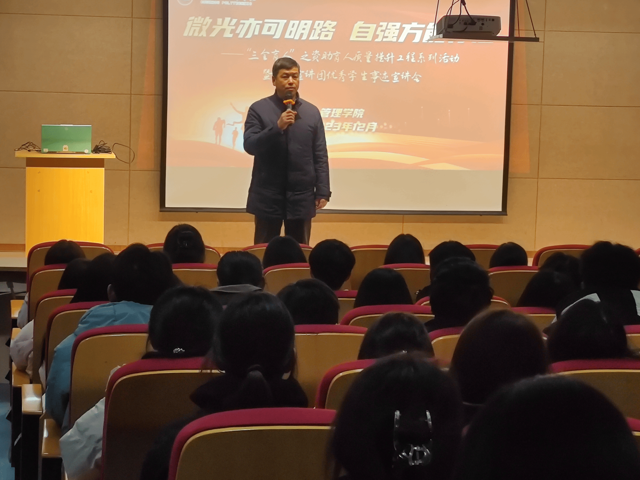榜样激发动力,努力沉淀实力。为了进一步营造良好的学习氛围,激励同学们自立自强、拼搏向上,帮助同学们破解迷茫、化解焦虑、锚定目标、坚持不懈向前奋斗,管理学院“三全育人”之资助育人质量提升工程系列活动暨优秀学生事迹报告会于12月12日-13日在南阶203分批次举行。院党总支书记耿学刚、部分专职辅导员出席活动,2023级400余名学生参加。