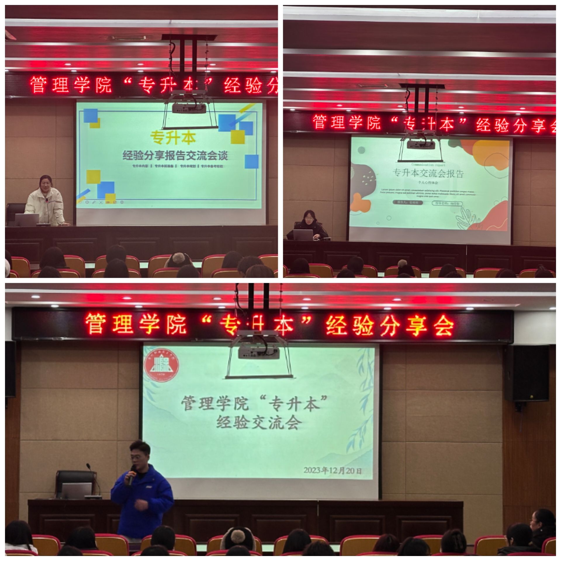 为持续推进学院学风建设,更好地为学院拟升本的学生提供帮助,2023年12月20日下午管理学院邀请本科教育的3位学生在南阶205开展“专升本”经验交流会,管理学院2022级、2023级学生参加本次交流会。